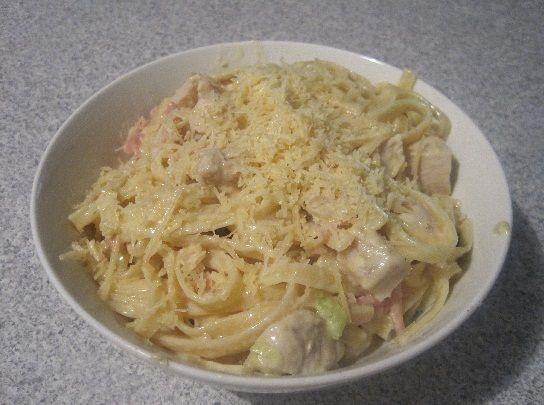 Cocine los fettucini y agréguelos a la salsa espesa de pollo y tocino.