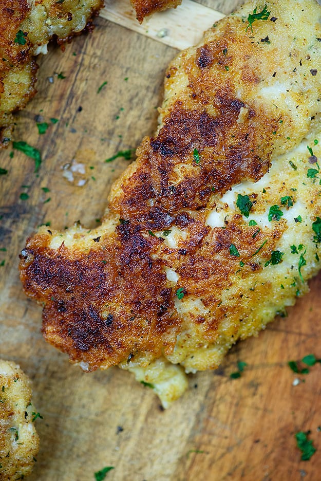 El pollo con costra de parmesano es crujiente y sabroso por fuera y muy jugoso por dentro. ¡Te encantará lo simple que es esta receta de cena entre semana!