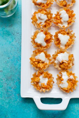 - Asegúrese de que el horno esté configurado a 350 grados F. Coloque los mini cucharones de ollas de Athens Foods en una bandeja para hornear. Agregue el pollo de búfalo a las conchas de filete de manera uniforme. Cocine 8-9 minutos.