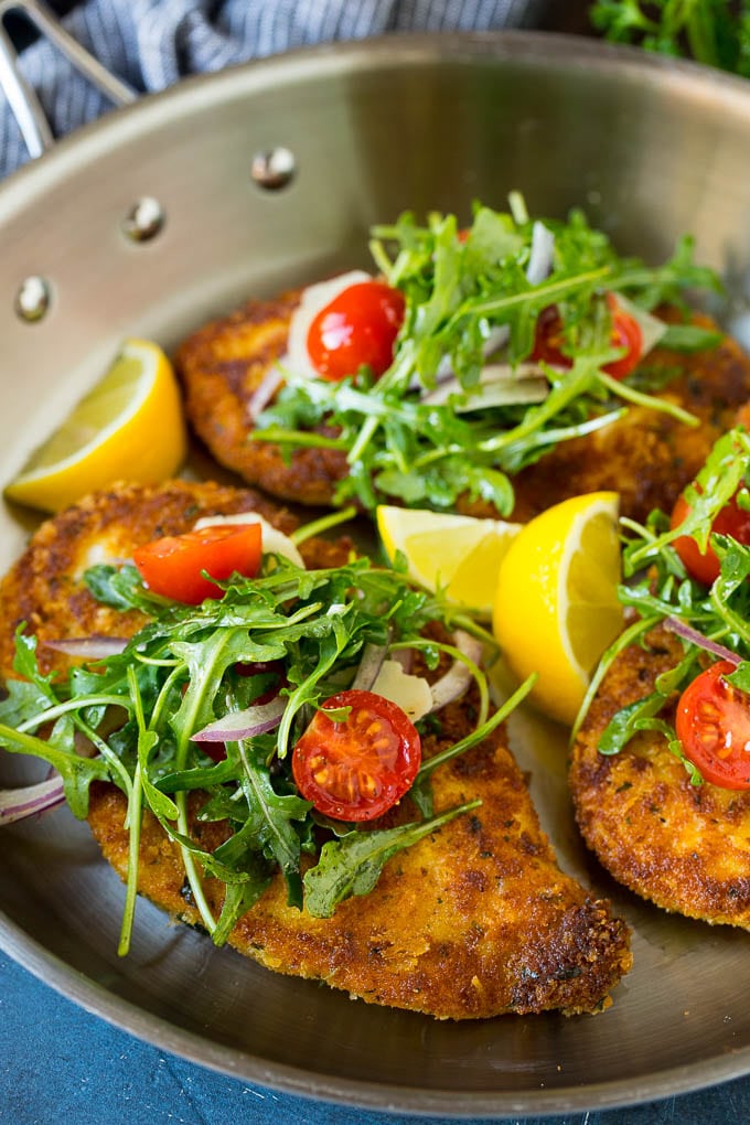 Comience cortando la pechuga de pollo por la mitad para hacer dos piezas más delgadas. También puede comprar pechugas de pollo delgadas para evitar cortar las pechugas más grandes por la mitad. Coloque cada trozo de pollo entre dos pedazos de envoltura de plástico. Triture el pollo en rodajas finas. Sumerja cada trozo de pollo en harina, luego en huevos y luego en pan rallado. Cocine el pollo en el aceite hasta que esté crujiente, dorado y bien cocido. Mezcle la rúcula, los tomates, la cebolla roja, el jugo de limón, el aceite de oliva y el queso parmesano. Sirva la ensalada sobre el pollo o al lado.