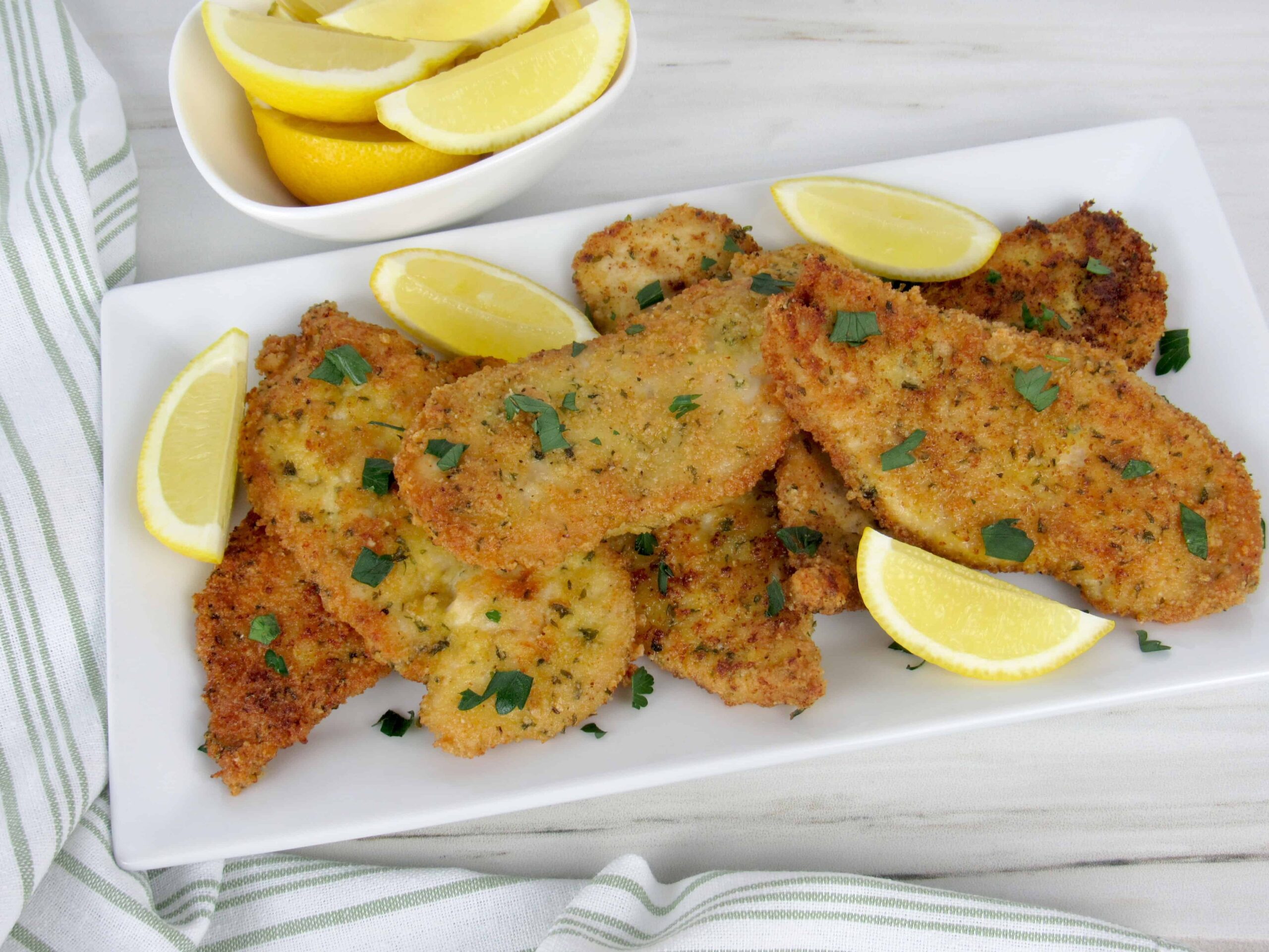 Tiernos filetes de pollo fritos en un crujiente y sabroso Low Carb and Keto, ¡luego rociados con un poco de jugo de limón fresco!