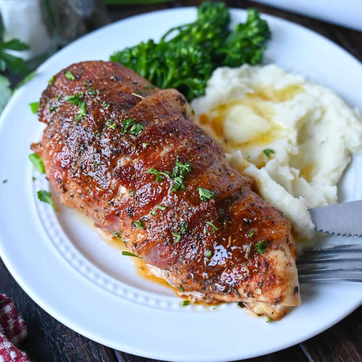 Estas pechugas de pollo están súper húmedas por dentro con tocino crujiente por fuera. Te garantizo que a toda la familia le encantará. Sírvelo con mi puré de papa rojo asado en microondas con ajo y mazorcas de maíz.