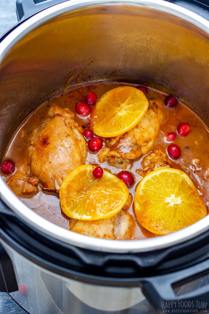 - Agregue la salsa de arándanos hasta que esté bien combinado. Agregue la mitad de los arándanos (ver nota 4) y 2-3 rodajas de naranja (ver nota 5), cierre la tapa y bloquéela en su lugar. Gire la válvula de liberación de vapor a SEAL y ajuste el temporizador a 6 minutos.