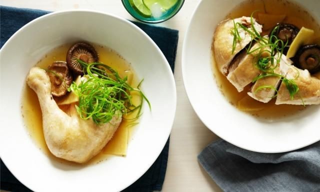 Retire el pollo del líquido y colóquelo sobre una mesa. Cortar y servir cubierto con cebollino rallado extra y un poco de caldo.