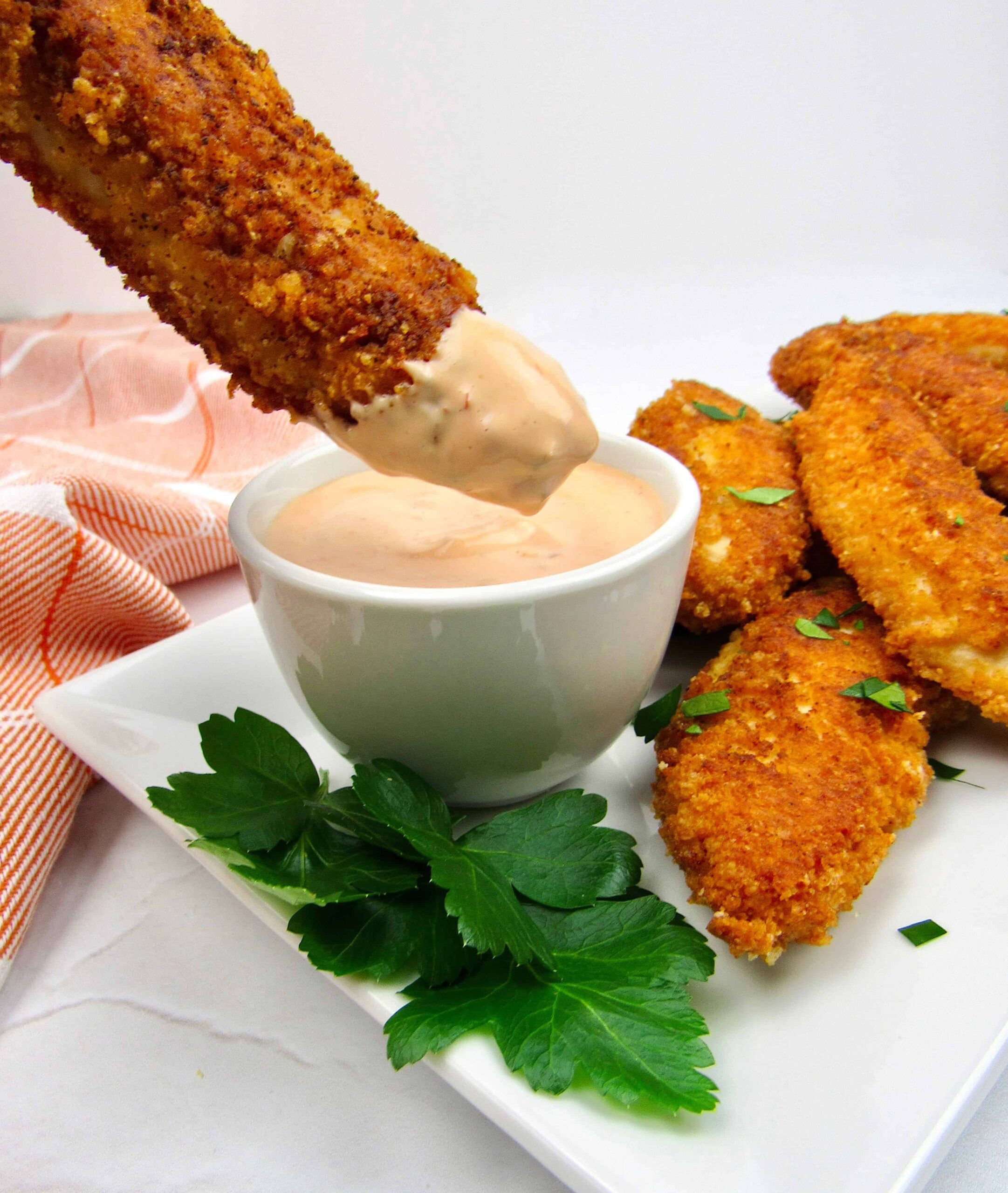 Las tiras de pollo frito crujiente son un delicioso y suculento aperitivo cetogénico. Se hacen con un empanado sin gluten y se sirven con la salsa de tu elección!