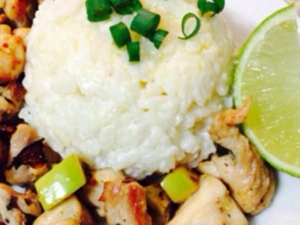 Sirve el arroz con coco en un plato, agrega el pollo. Servir con otra rodaja de lima.