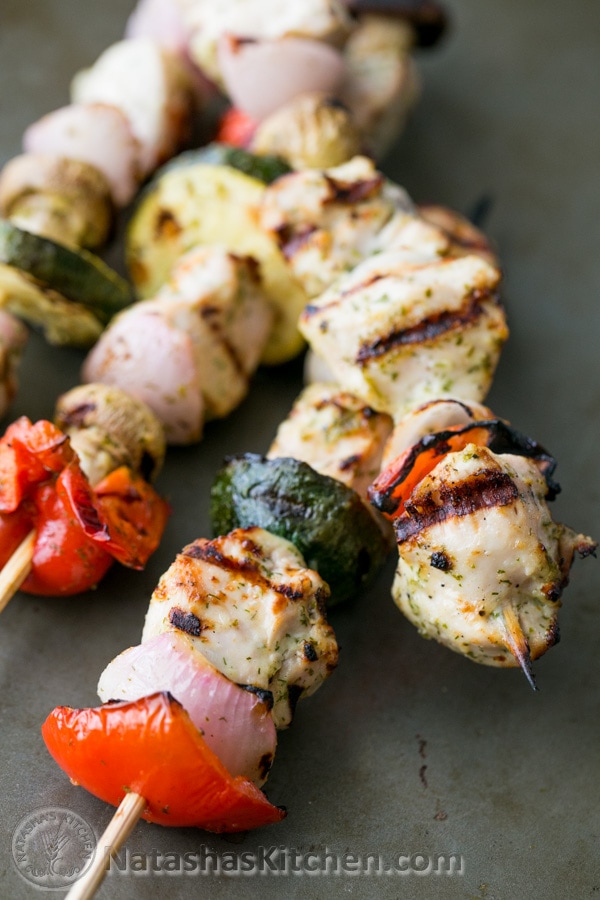 Comience precalentando su barbacoa a aproximadamente 400 ° F. Coloque la carne y las verduras en la brocheta y áselas a fuego medio con la tapa cerrada, volteándola cada 2 minutos hasta que el pollo esté completamente cocido, aproximadamente 15 minutos. ¡Gustar!