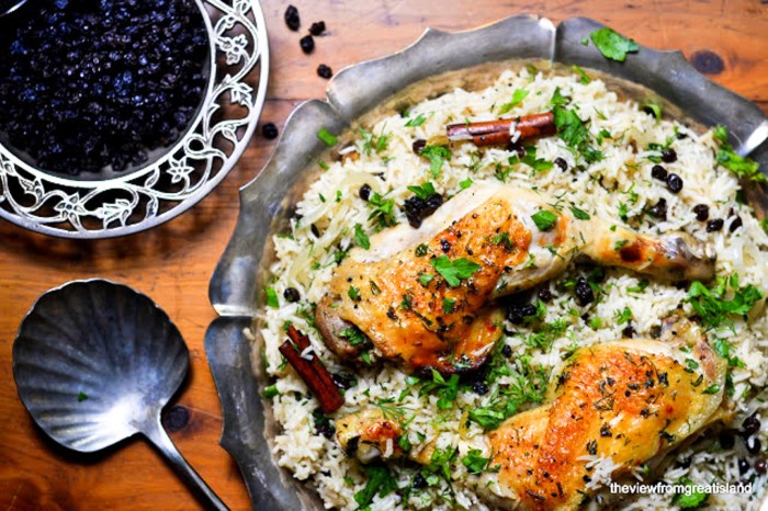 De entrada os diré que esta comida es espectacular, muy fácil de preparar y que el propio arroz vivirá en mi cocina muchos años más. Los aromas y sabores que emanan de él en cada etapa son embriagadores y no se desvanecerán después de una noche en el refrigerador. La combinación es sorprendentemente simple pero poderosa: las vainas de cardamomo, los palitos de canela, los clavos enteros, la sal y la pimienta son los condimentos y se mezclan con hierbas frescas y grosellas para hacer una comida memorable. El pollo dorado crujiente tampoco duele.