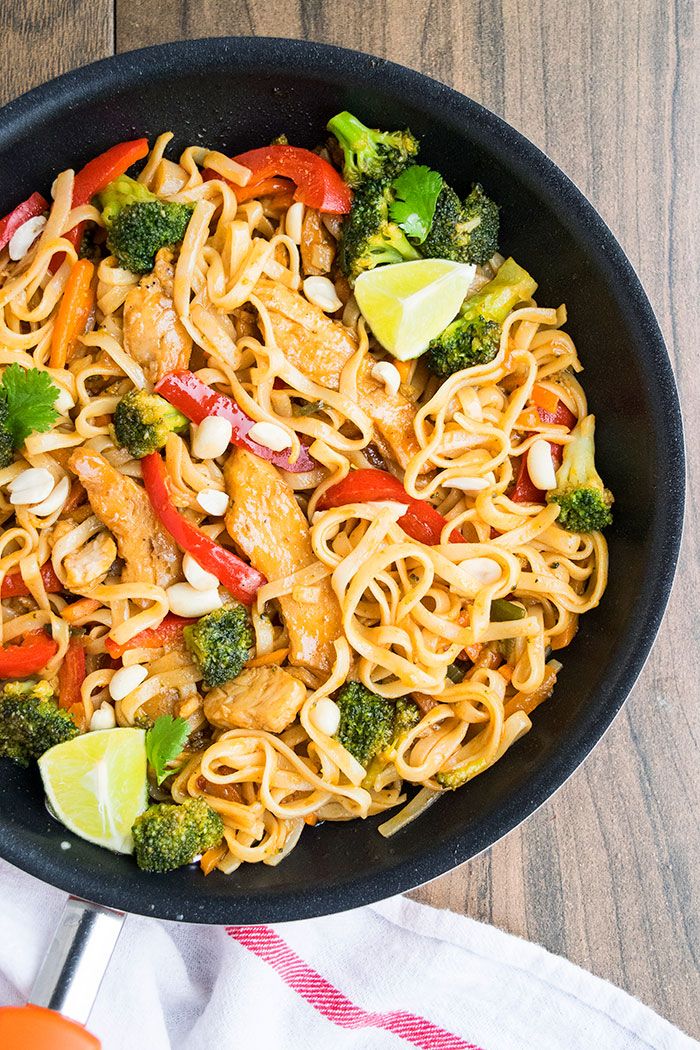 Receta rápida y fácil de Chicken Pad Thai, hecha en casa con ingredientes simples en una sartén en la estufa en 30 minutos. Dulce, picante y picante. Rellenos de tamarindo, salsa de pescado, verduras, fideos de arroz, maní.
