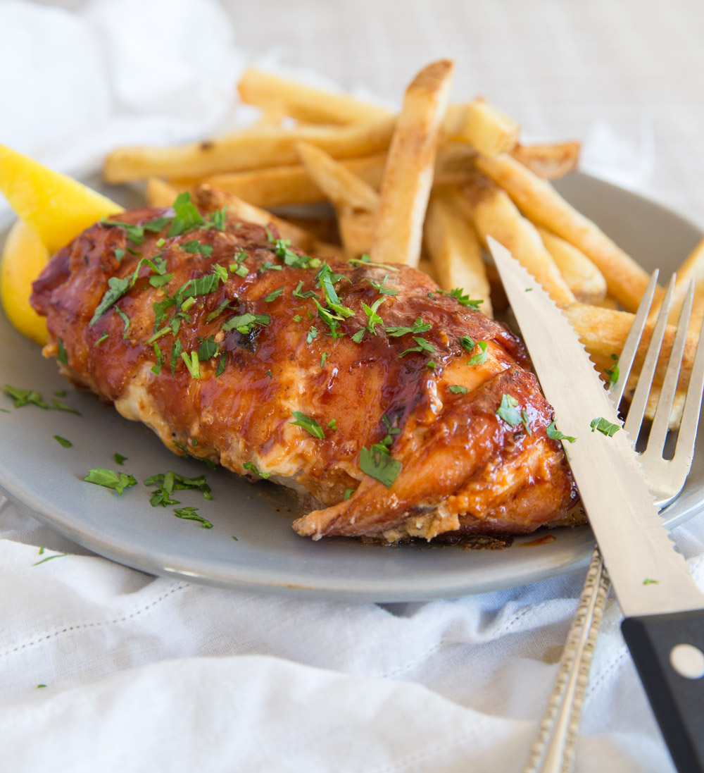 Unte con salsa BBQ y hornee a 200c/390f por 15 minutos, ajuste y cocine por otros 5 minutos o hasta que ya no esté rosado.