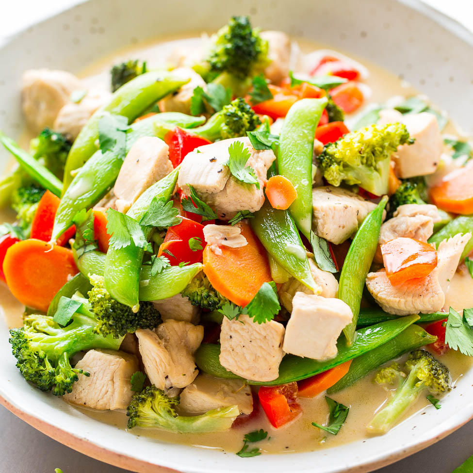 La leche de coco mantiene el pollo súper húmedo, le da cremosidad y un ligero dulzor que solo la leche de coco puede lograr. Use leche de coco enlatada (generalmente se encuentra en el pasillo asiático). Freír es fácil, está listo en 20 minutos y tiene mucha textura y capas de sabor. Mezcle y combine los ingredientes en función de lo que tenga a mano y disfrútelos, incluidas las verduras, las especias y las hierbas. Es tan versátil y saludable. Sirva tal cual o con arroz si lo desea.