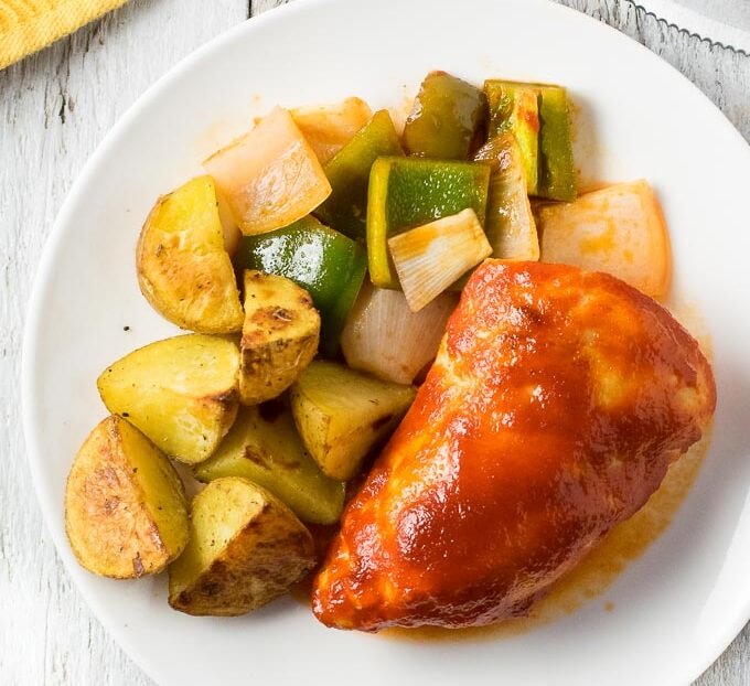 Coloque los pimientos picados y las cebollas en una bandeja para hornear y coloque el pollo encima. Cepille el pollo con la mezcla de azúcar moreno sriracha, rociando cualquier recordatorio sobre las verduras.