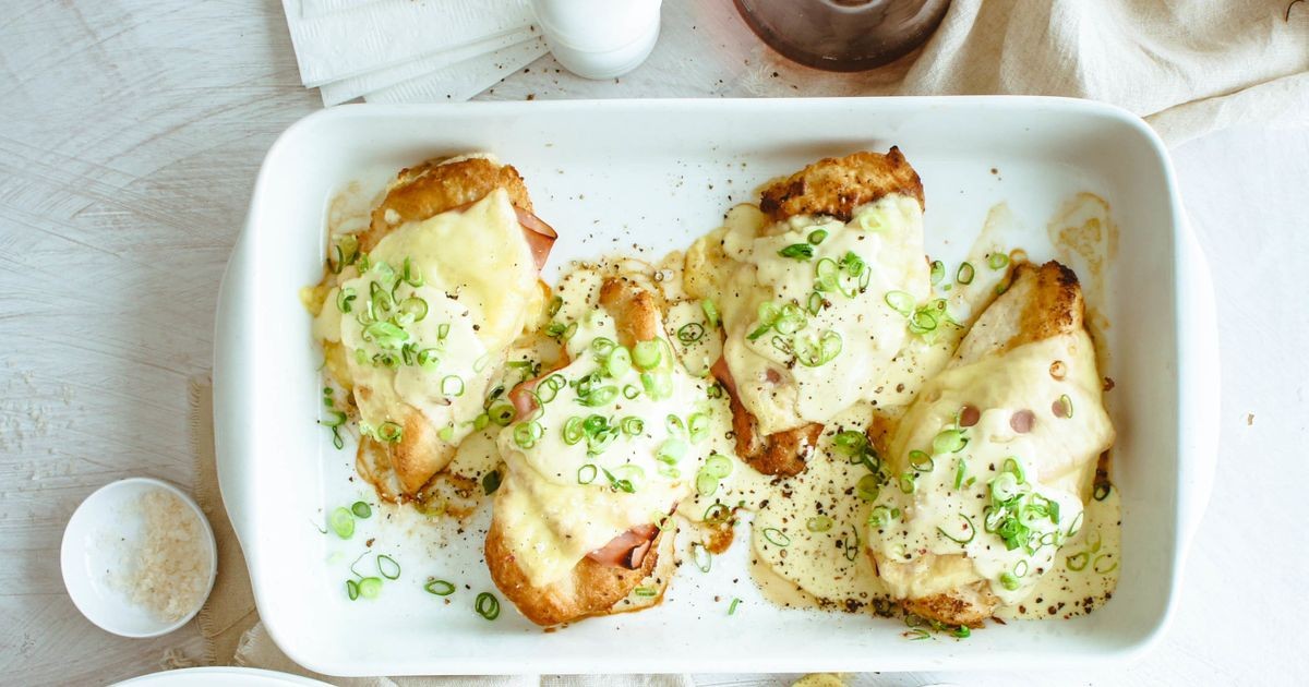 Retire el pollo a un plato resistente al calor y coloque una loncha de jamón y queso encima de cada pieza.