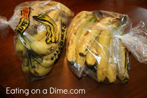 Primero comencé a pelar plátanos y puse tres en cada bolsa que etiqueté como “Plátanos para pan de plátano”. Ahora tengo plátanos maduros listos para mi receta favorita de pan de plátano.