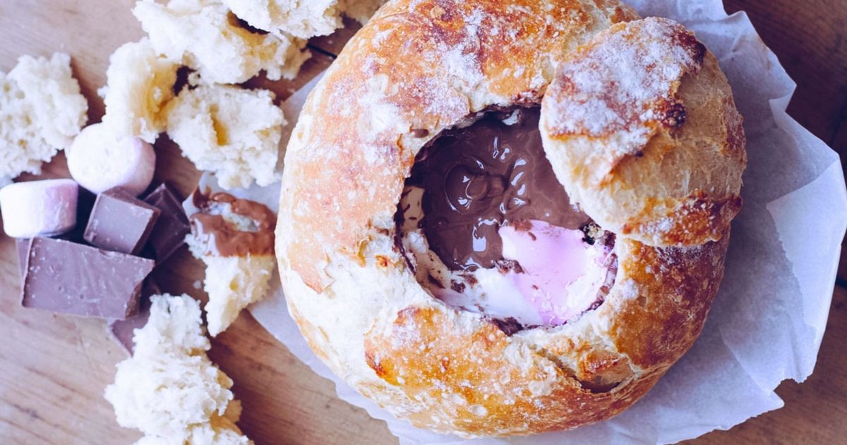 Llene la cavidad de pan vacía con capas de malvaviscos, cuadrados de chocolate y trozos de galleta. Cubrir con la tapa.
