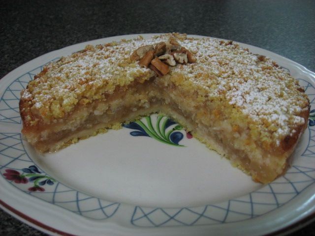 Presionar un tercio de la mezcla de pan rallado en la base de la sartén, añadir la mitad de la mezcla de manzana, poner otro tercio de pan rallado, la manzana restante y terminar con el pan rallado restante.