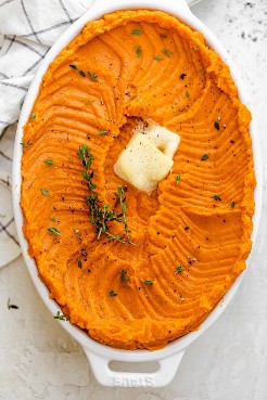 Mi Puré de Papas Saludable es imprescindible para el Día de Acción de Gracias, pero estos Puré de boniato saludable sólo puede competir con ellos. Las batatas a menudo se sirven como guarnición dulce con malvaviscos o azúcar con canela. ¡Pero esta sabrosa receta es una opción más liviana que aún resalta el sabor dulce natural de las batatas y combina bien con pavo o pollo!