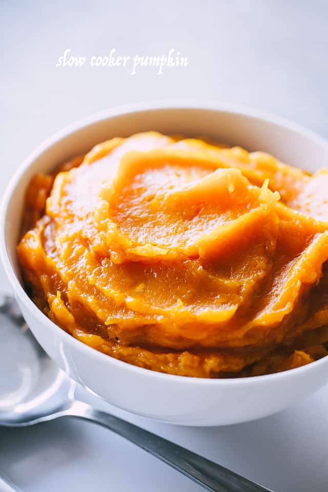 La mejor receta de un ingrediente que he hecho hasta ahora. Estoy tan emocionada que no puedo soportarlo más. Quiero decir. Mira este puré de calabaza. Tan fácil y tan cremoso… y mi mejor amigo, mi olla de cocción lenta, hizo todo posible. ❤