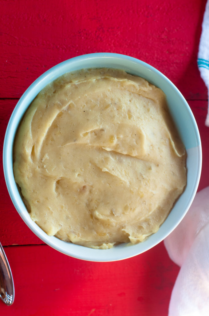 Después de que las papas estén cocidas, es hora de triturarlas. Vierta la leche vegetal caliente, sal y pimienta. Me gusta usar mi batidora para hacer puré de papas en la olla de cocción lenta.
