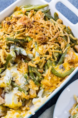 Pero creo que realmente te gustará la forma en que una capa de guiso de judías verdes (¡no menos queso cheddar!) sabe a puré de papas. Yo uso judías verdes frescas, pero puedes usar conservas, así como una lata de crema de champiñones, un poco de leche y salsa de soja, y muchas cebollas fritas.