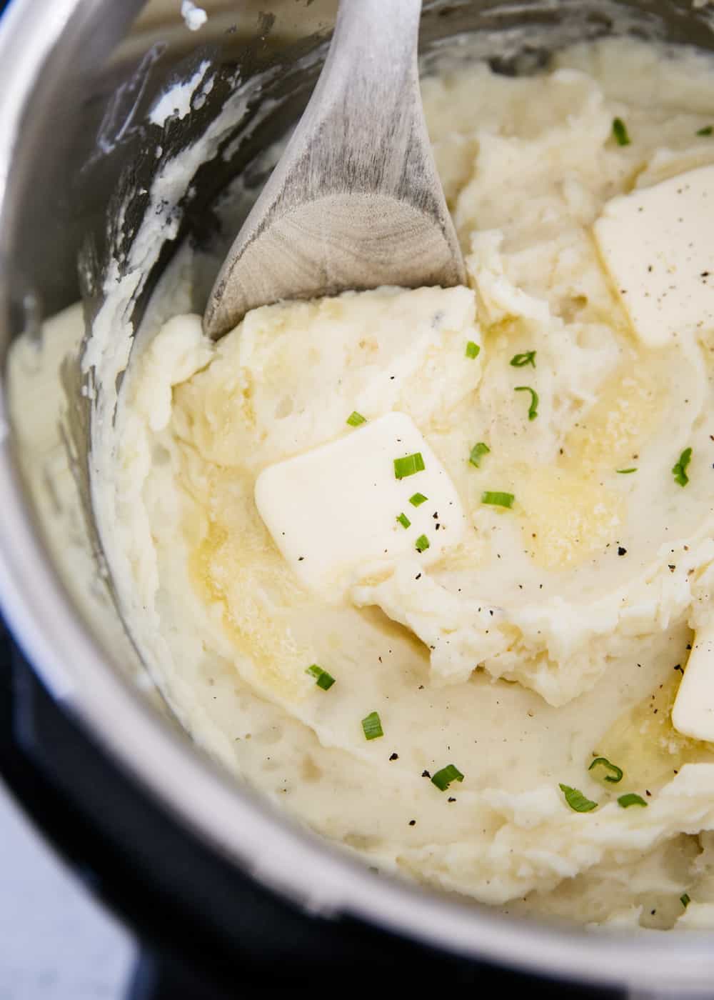 - Cuando suene el temporizador, suéltelo rápidamente girando la válvula. Una vez que la tapa esté cerrada, déjela reposar durante unos minutos para permitir que se evapore el vapor/líquido adicional. No deberías necesitar drenar. Luego agregar la mantequilla derretida y la nata. Triture con un machacador de papas inmediatamente después de cocinar. Agregue 1 cucharada de crema espesa a la vez, hasta alcanzar la consistencia deseada. Tenga cuidado de no hacer puré en exceso. Sal y pimienta para probar.