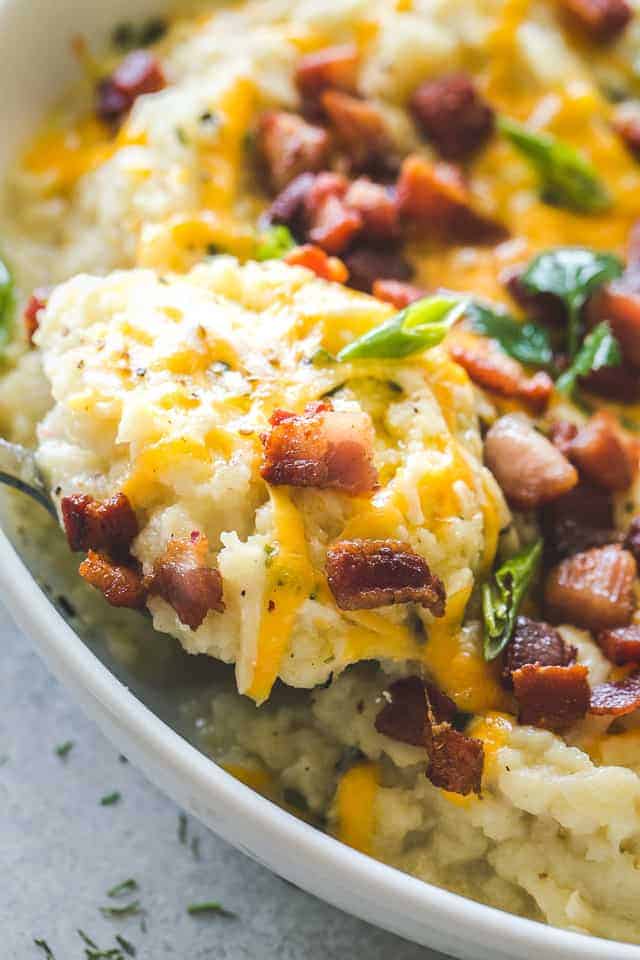 No voy a decir que el puré de coliflor me sabe SOLO a mí Puré de papas al estilo campestre¡PERO la textura es casi perfecta y es deliciosa! Además, cuando agregas todos los maravillosos ingredientes: el tocino lo hace todo mejor – Olvidarás que estás comiendo verduras y no patatas fritas.