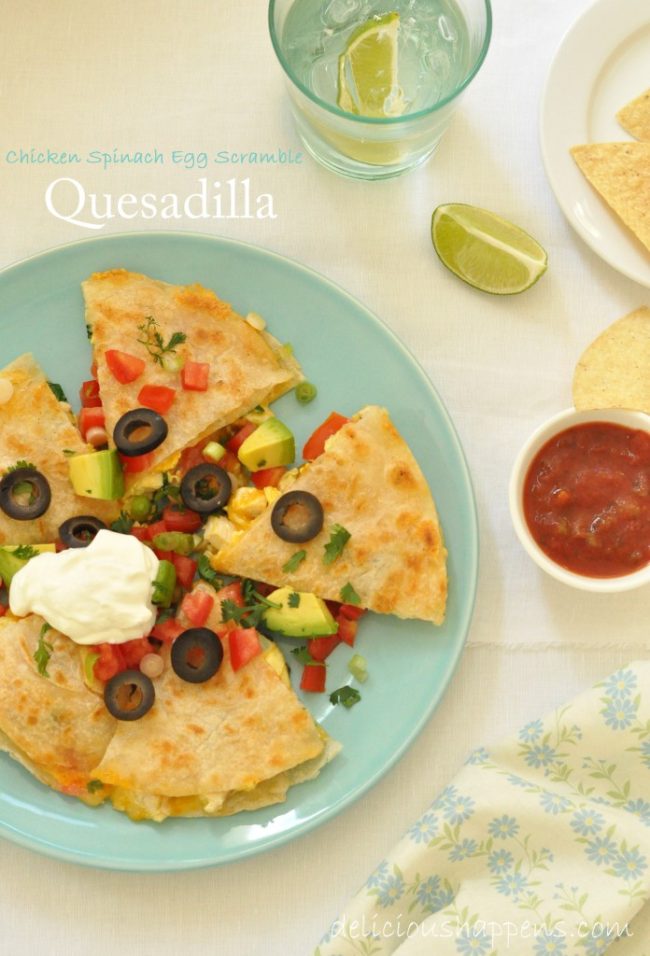 Este desayuno de Quesadilla está relleno de huevos revueltos, pollo, espinacas y queso.