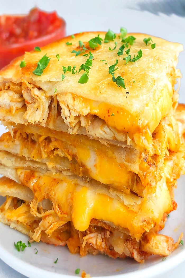 Quesadillas De Pollo Con Tocino– Si tiene pollo sobrante de esta pasta Chicken Bacon Ranch (una sartén), úselo en lugar del taco de pollo.