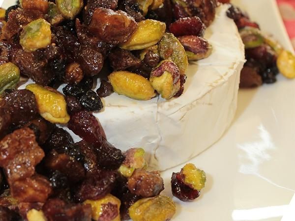 Mezclar la carne picada con la fruta y los pistachos y disponer encima el queso brie. Cocine durante 15-20 minutos.
