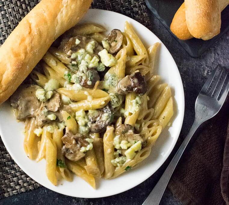 Esta sabrosa pasta de queso azul y champiñones presenta tallarines penne bañados en una salsa cremosa de queso azul cargada con suaves champiñones.