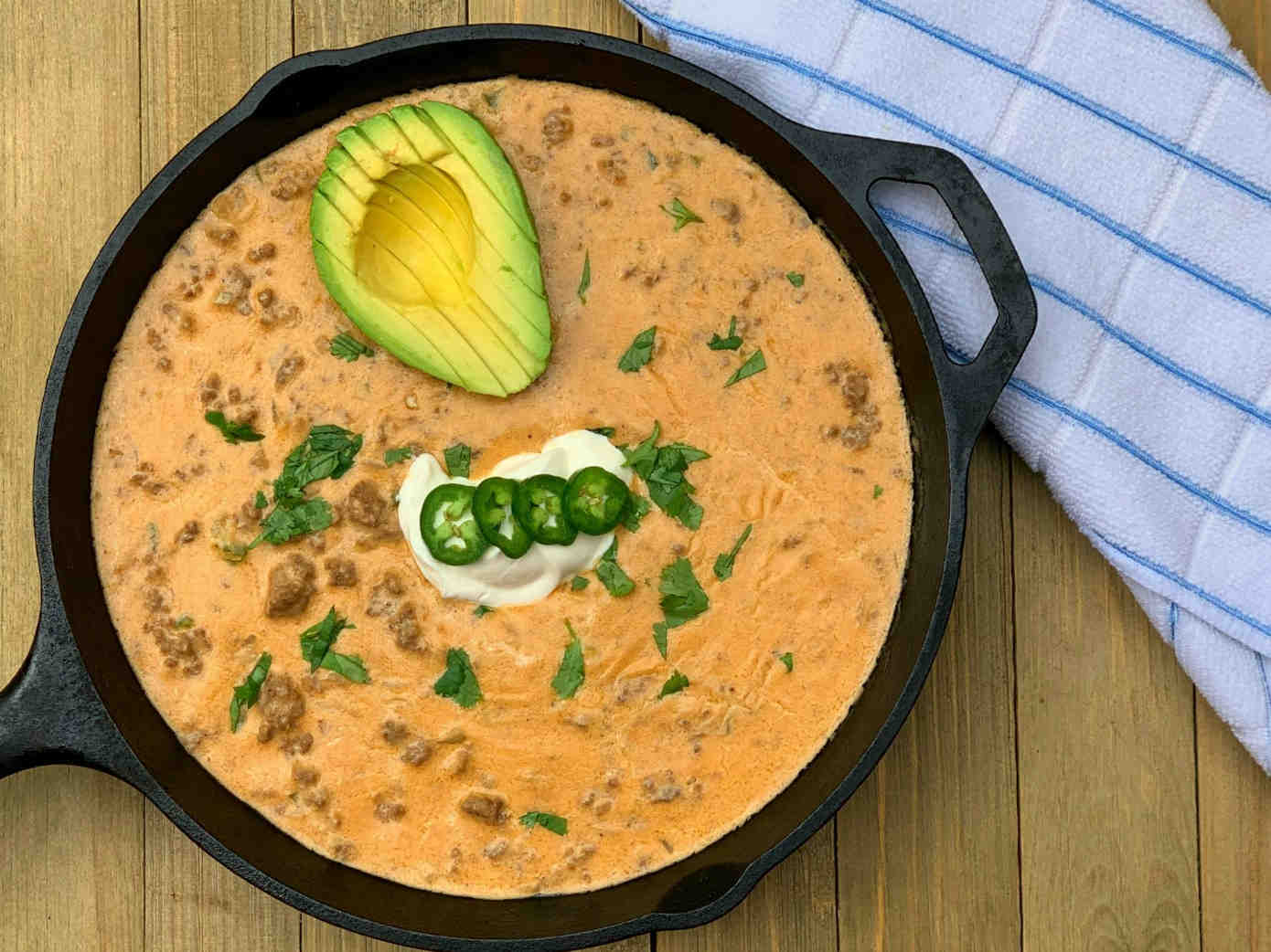 ¡El queso cargado hecho en casa es la salsa de papa favorita de TODOS sin ninguno de los ingredientes de queso falso procesado! La carne molida, 3 tipos de queso, pimientos, cebollas y aderezos hacen de esta salsa una comida por sí sola.