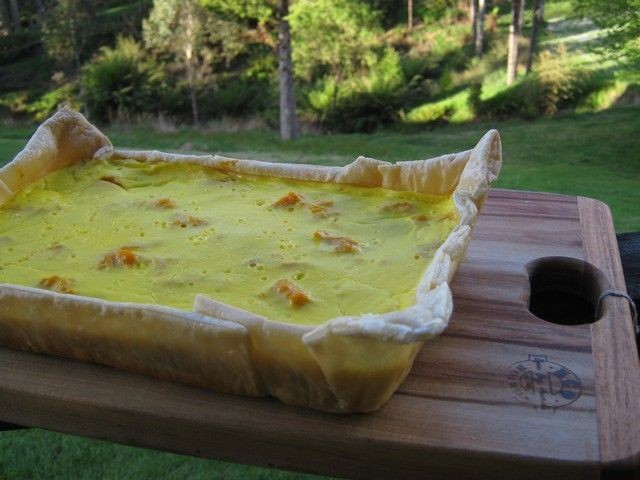 Esto lo hago cocinando primero la calabaza, que le da un sabor delicioso, o le puedes agregar champiñones, cebollas tiernas o tocino, lo que tengas en la heladera y lo pones en el molde para pay, recordando que el líquido que producen los huevos es La la crema agria es bastante abundante.