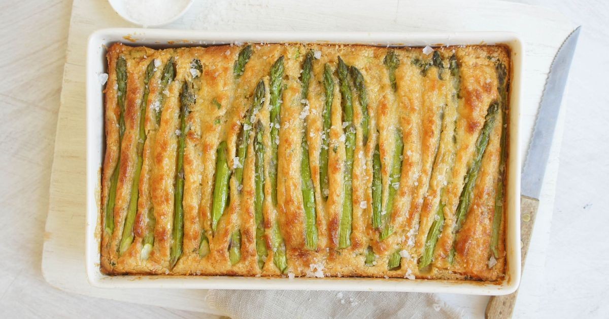 Vierta en una fuente para hornear engrasada o budín. Disponer los espárragos encima.
