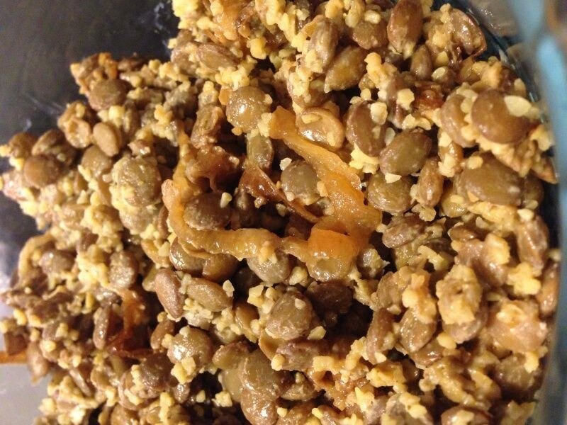 Agregue las lentejas, el comino, la sal y la pimienta y mezcle.