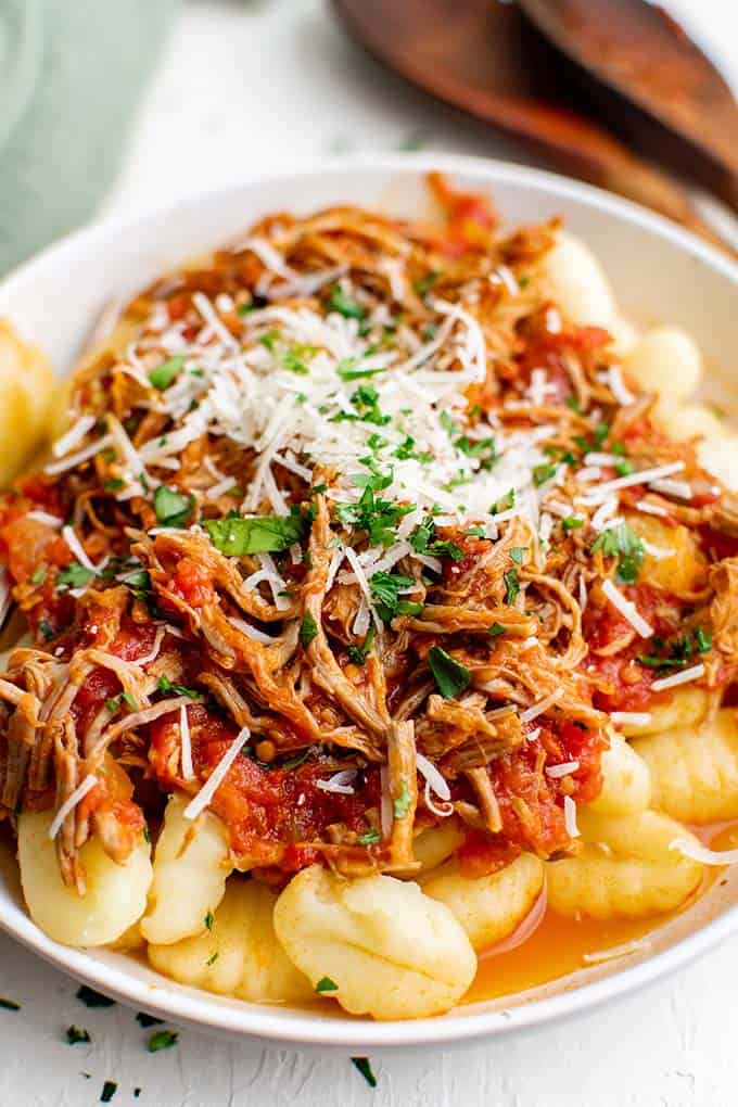 ¡Este plato es saludable, más saludable de lo que piensas, y también un gran alimento reconfortante mientras nos preparamos para finalmente hacer la transición a temperaturas más cálidas! Un asado estofado que se ha cocinado a fuego lento en buena compañía con tomates, ajo, cebollas, vinagre balsámico y cebollas de San Marzano crea una mezcla irresistible de sabores italianos. ¡Lo mejor de todo es que es delicioso servido con casi cualquier cosa! ¡Nos encanta este sabroso ragú de carne servido con ñoquis, polenta, puré de papas o tu pasta favorita! De acuerdo con el espíritu de versatilidad, puede ponerlo en su olla de cocción lenta y hervir todo el día, llenando su cocina con grandes olores como los nuestros. Salsa De Espagueti Crockpot, o usa tu olla instantánea si quieres más tiempo. ¿Te apetece un sabor italiano más intenso? Prueba nuestros pimientos asados Ñoquis o espaguetis instantáneos!