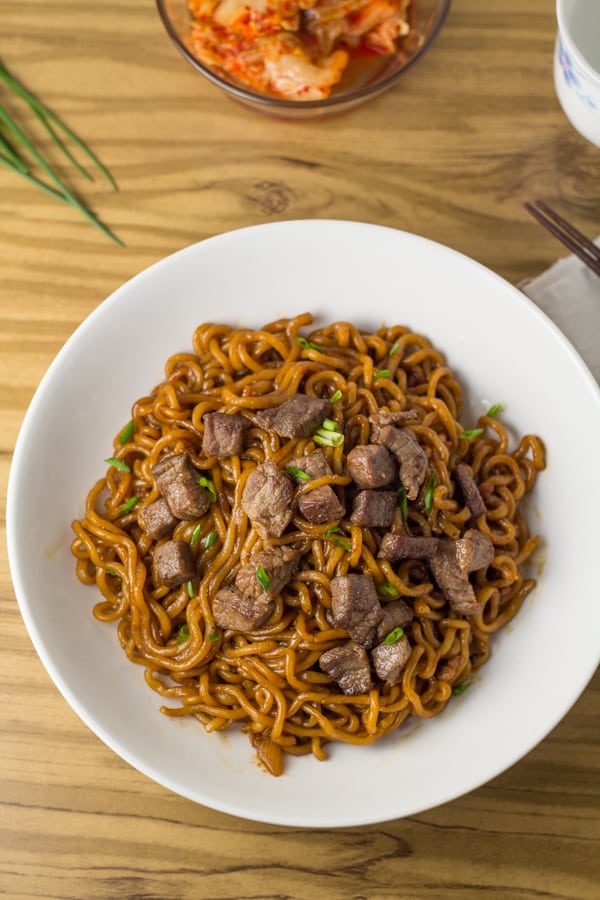 En general, el plato es fácil de preparar y combina dos marcas populares de fideos instantáneos coreanos: Chapagetti y Neoguri. Me alegro de haberlos encontrado a ambos en nuestra tienda de comestibles asiática local. El plato resultó bien ya que los fideos estaban perfectamente cocinados y condimentados. No me gustan las comidas picantes, pero esta receta tiene la cantidad perfecta de especias. La carne añadida hace que este plato de pasta sea más sustancioso.