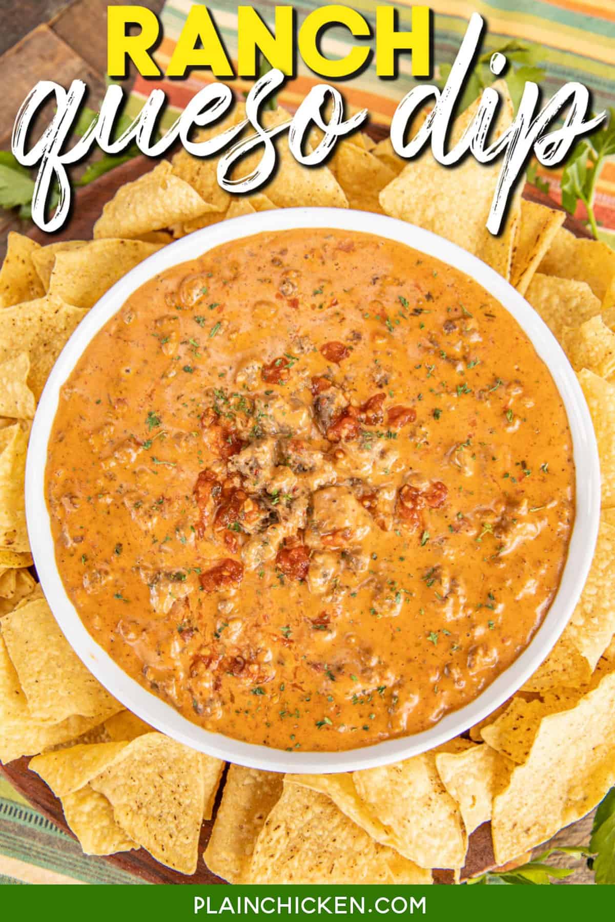 Ranch Queso Dip: ¡El mejor dip de queso! Carne molida, salchicha, salsa para tacos, salsa ranchera, salsa, queso Velveeta, queso crema y chile en polvo. ¡Podría tener una comida con este delicioso aderezo ranchero! Se puede hacer en la estufa, en una olla de cocción lenta, en el horno o en el microondas. Sirva con chips de tortilla, apio y zanahorias.