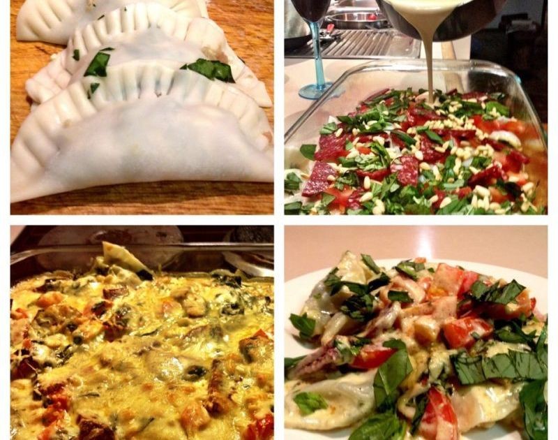 Montaje: Mezclar los raviolis, el salami, los tomates, los piñones y el resto de las hojas de albahaca en un refractario de cristal grande.