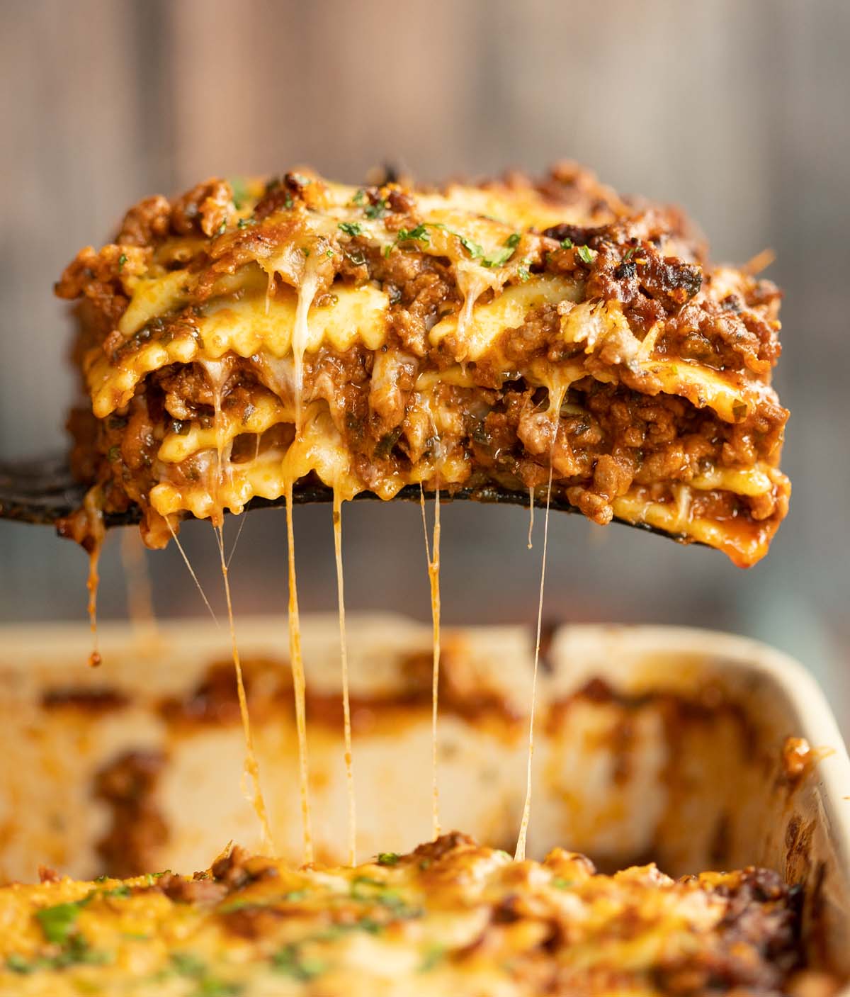 Por supuesto, estoy usando el término “lasaña” de manera bastante amplia aquí antes de que alguien me grite ? Piensa en raviolis horneados en capas con ragú de carne tierna y jugosa y mozzarella rallada. ¡Ciertamente no es para los débiles de corazón! Seguime…
