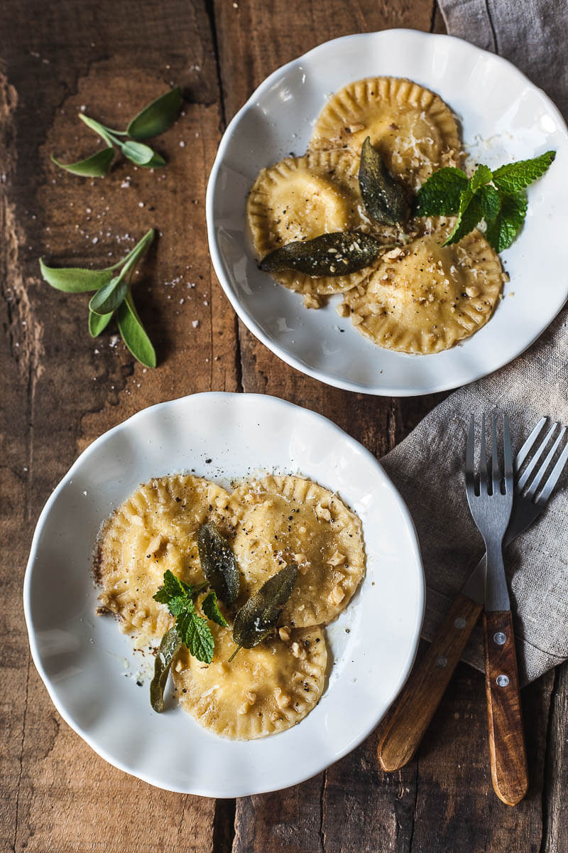 ¿Fideos caseros? ¡Este ravioli de ricotta ahumado en salsa de mantequilla de salvia es muy fácil de hacer, vegetariano y delicioso!
