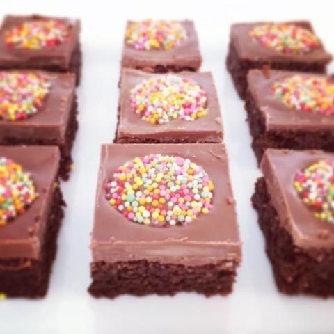 Derretir el chocolate a fuego medio en el microondas durante 3 minutos (removiendo cada 30 segundos con una cuchara de metal) y verter sobre la rodaja. Trabajando rápidamente, coloque las pecas en líneas limpias.