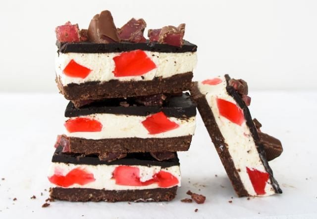 Relleno: Espolvorear gelatina sobre agua en un vaso resistente al calor. Coloque la taza en una cacerola con agua hirviendo hasta que se disuelva, luego enfríe un poco. Usando batidores eléctricos, bata el queso crema, el azúcar y la vainilla hasta que quede suave. Agrega la mezcla de gelatina. Agregue la crema hasta que se combine. Extienda la mitad de la mezcla en la bandeja para hornear. Espolvorear con cubos de gelatina. Vierta la mezcla de cheesecake restante en el molde y alise la superficie. Llevar a la heladera por 2 horas o hasta que esté listo.