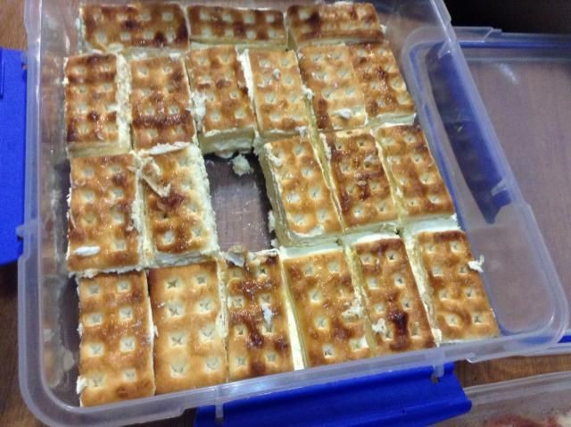 Extienda la mezcla de queso crema uniformemente sobre las galletas y agregue más galletas, con el lado del azúcar hacia arriba.