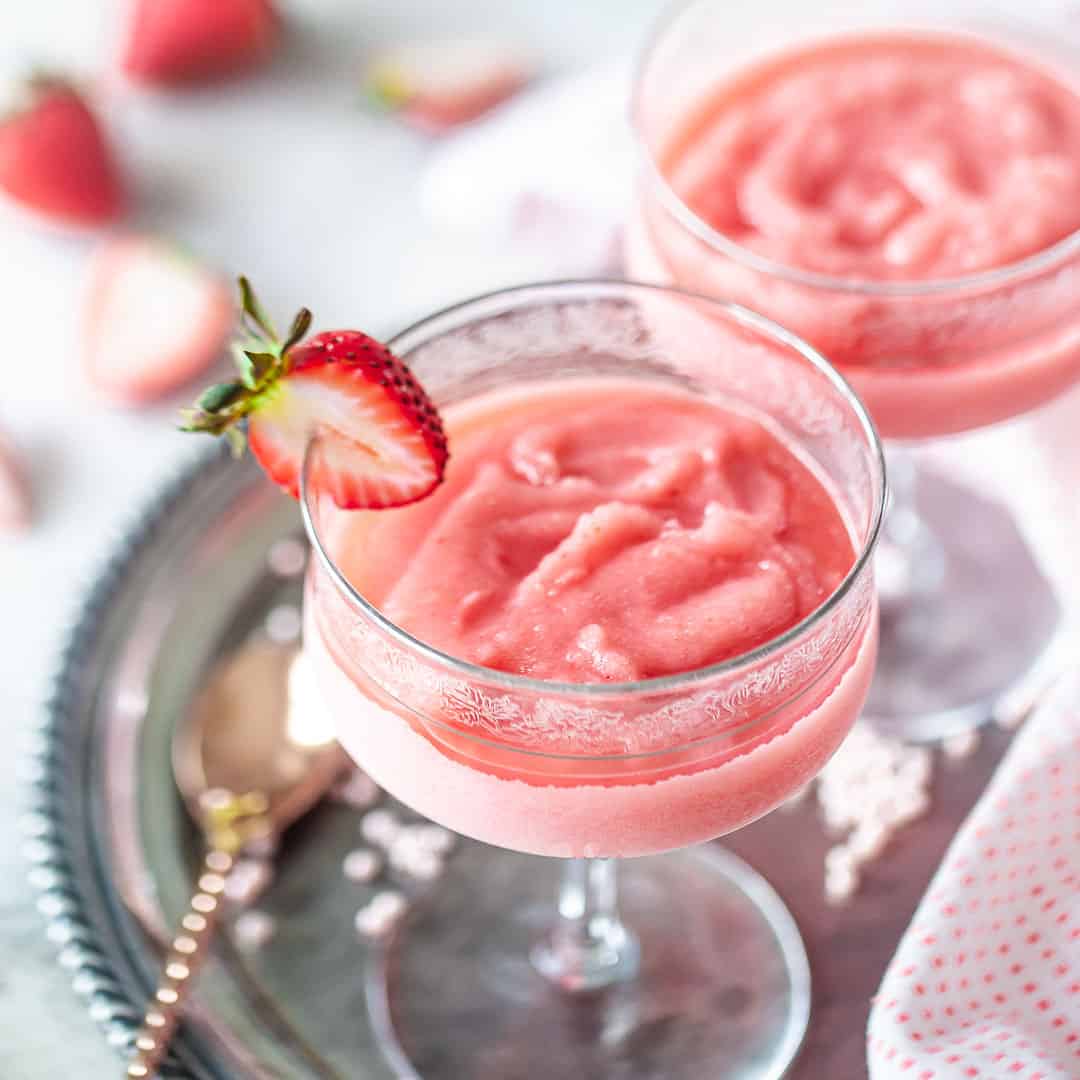 ¡Esta receta de helado es muy divertida y refrescante! Granitos de vino rosado helado mezclados con fresas, para un hermoso cóctel rosado para la temporada de calor.