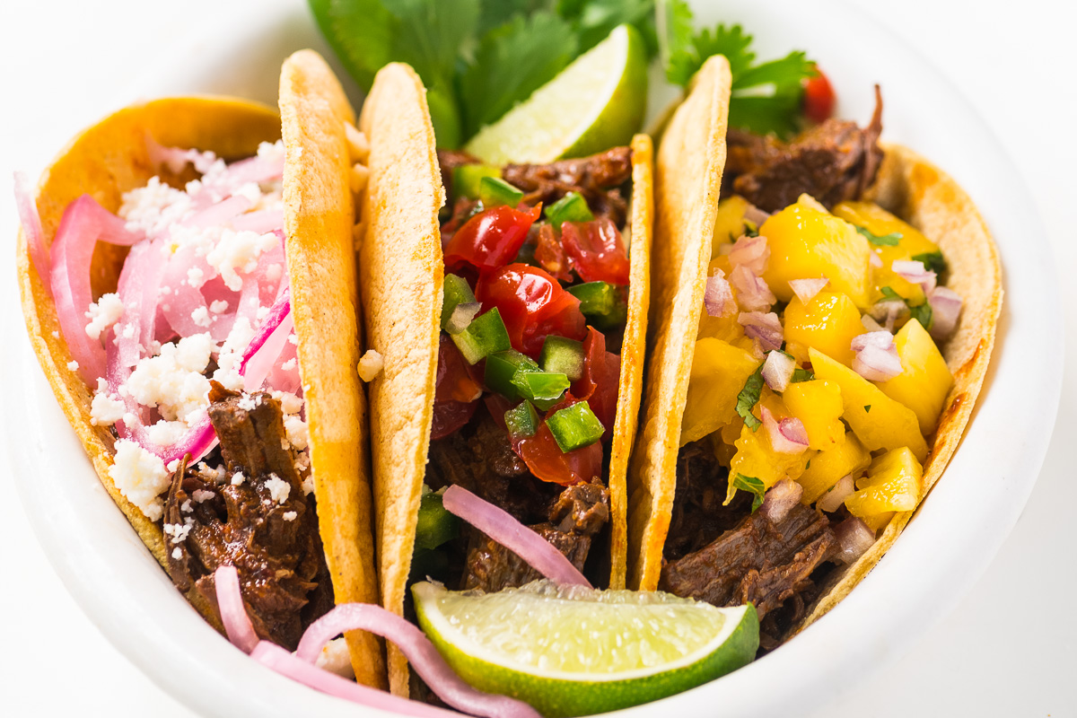 Triture la carne con 2 tenedores. Agregue nuevamente a la salsa y revuelva para combinar. ¡Tu barbacoa está lista! Sirva con tortillas de maíz y los ingredientes de su elección.
