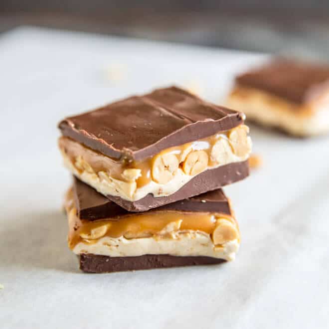 Sándwich de turrón de dos capas de chocolate negro (que prefiero a las barras de chocolate con leche Snickers “reales”) con malvaviscos, maní crujiente y delicioso caramelo. Y no te preocupes, ¡todo es fácil!
