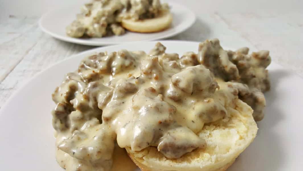 Esta sencilla salsa casera de salchicha y bizcocho para dos tiene salsa de salchicha al estilo sureño y bizcochos caseros en hojaldre con un toque de miel.