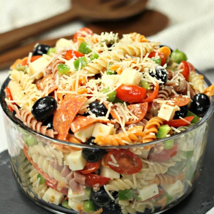 Si necesita una guarnición sencilla para una comida entre semana, pruebe esta ensalada de pasta italiana. ¡Está delicioso y seguro que será un éxito! ¡Me encanta traer este plato y la gente siempre lo traga! ¡No se sorprenda cuando la gente le pida la receta! ¡Siempre es un éxito!