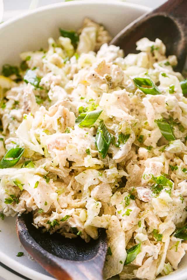 ensalada clásica de pollo – Pollo desmenuzado, pepinos en escabeche y apio crujiente cubierto con una salsa deliciosamente cremosa. Te encantará lo fácil que es organizar esto para tu próximo picnic o fiesta de verano.
