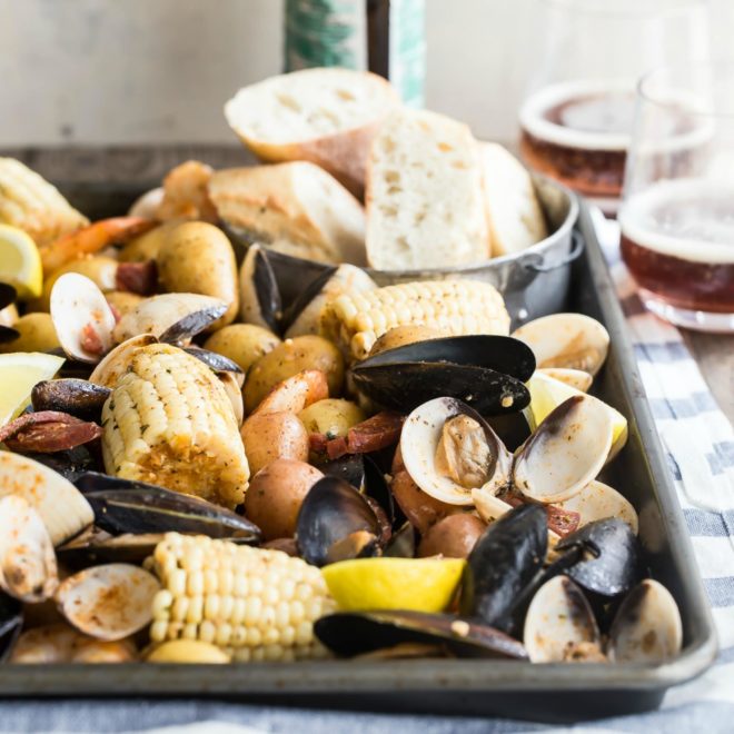 Tradicionalmente, un clambake es una reunión al aire libre donde se cocinan almejas, camarones y otros crustáceos en un hoyo, sobre rocas calientes y cubiertos de algas. A veces también se le agrega pollo, maíz y papas. Esta versión se salta las algas, pero claro, si las tienes… ¡añádelas!